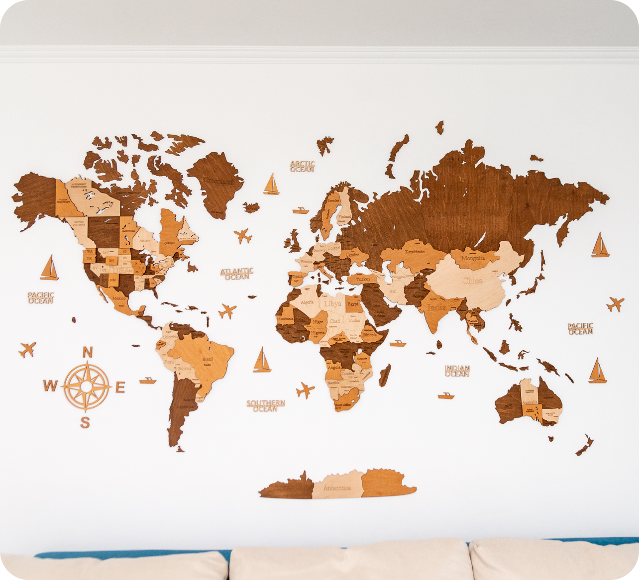 A wooden map of the world is a beautifully crafted piece of art made from high-quality wood materials. The map displays the continents, countries, and bodies of water of the world, and can be used as a learning tool or a unique piece of home decor. Wooden maps are durable and long-lasting, making them a great investment for any home or office. They come in a variety of sizes and styles, from minimalist designs to intricately detailed maps with raised topography.